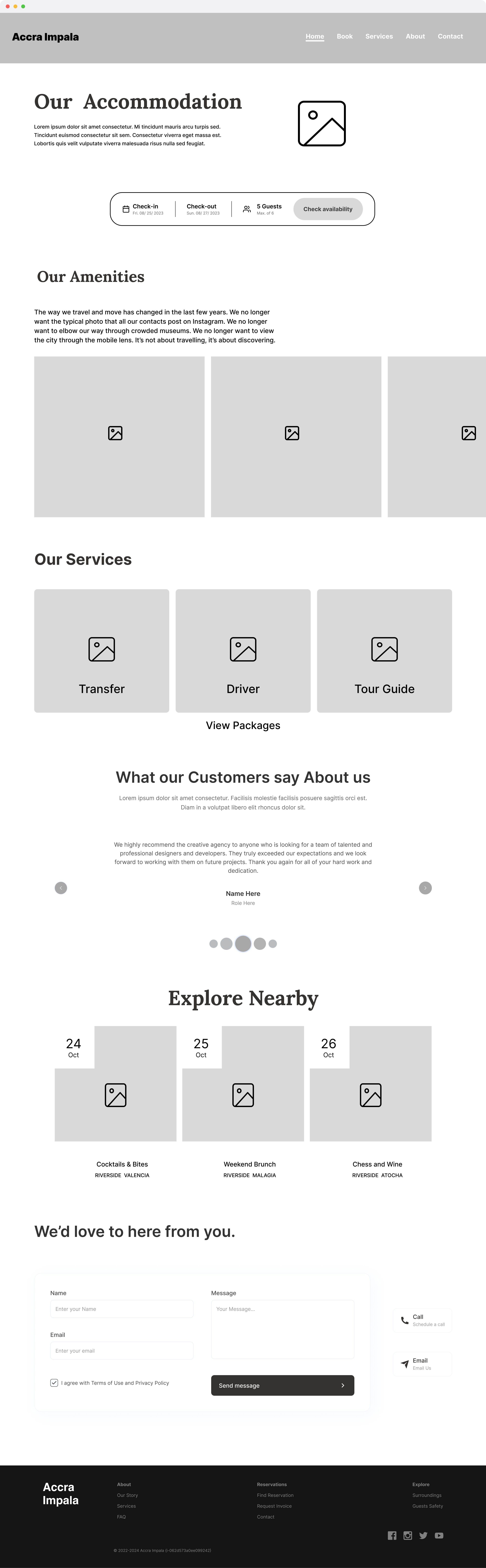 In the "Our Amenities" section, captivating photos showcase the property's unique features, while detailed a description bring them to life. Beyond the accommodation, "Services" reveals a range of enriching experiences, from cultural excursions to airport transfers, all available for seamless booking.
