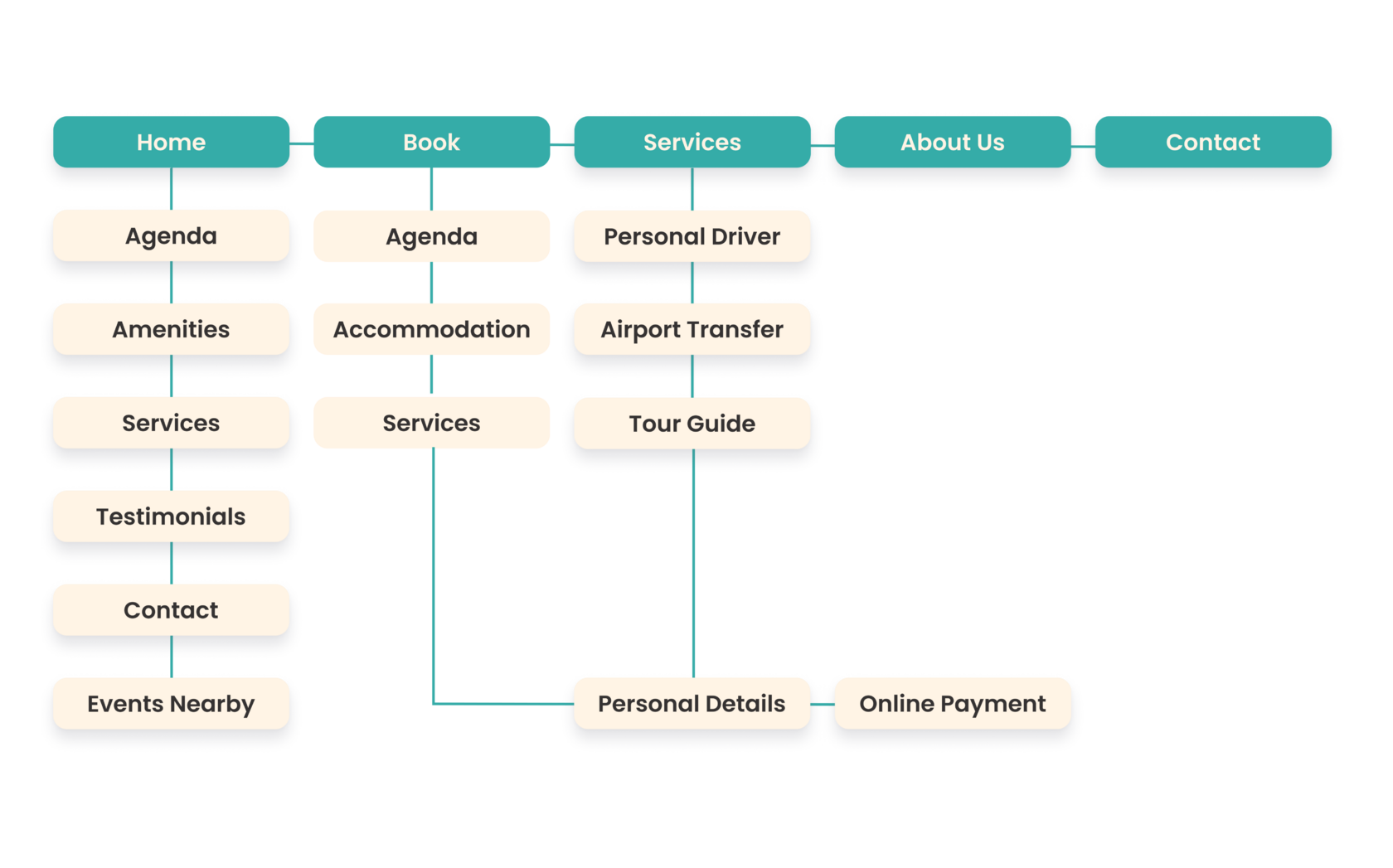 Informed by user research, the "Happy Path" user flow in this user-centric design facilitates effortless date selection, browsing and booking of unique services like airport transfers and cultural experiences, and secure Bank Payment transactions. A confirmation message finalises the booking, ensuring a smooth and stress-free experience for guests.