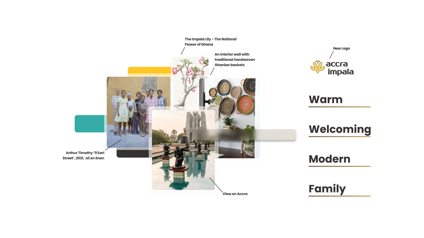 This style tile embodies the Accra Impala B&B's unique blend of quality and Ghanaian charm. Inspired by the vibrant colours and textures of Ghanaian art and nature, the palette features warm to cool contrasting Primary Colours, reflecting the country's diverse landscapes. The Impala Lily, Ghana's national flower, also finds its way into the design, echoing the logo and reinforcing the B&B's local identity.