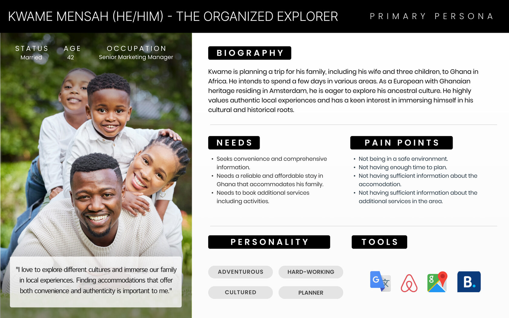 Leveraging our research, we crafted a customer persona: Kwame Mensah, the Organized Explorer. Planning a family trip to Accra, Kwame seeks reliable and affordable accommodations with readily accessible information. This persona guided our transition into the ideation phase.