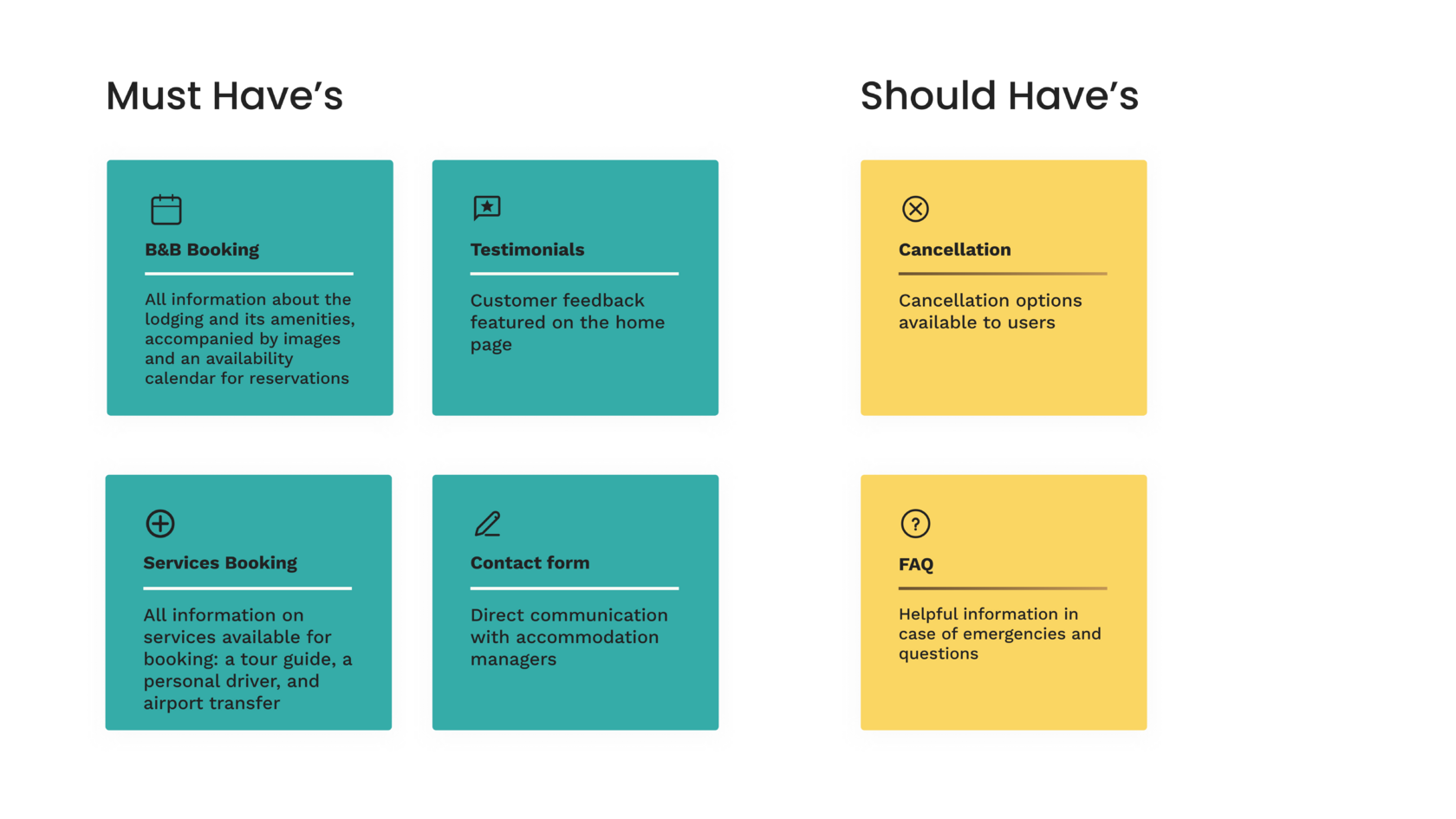 With Kwame's seamless booking experience in mind, we used the MoSCoW method to translate research insights into actionable features. We prioritized Must-Haves that streamline his journey: Effortless accommodation & service booking management with a reservation overview and a communication form with property managers. This ensures the initial design focuses on functionalities crucial for his journey. Emergency booking cancellation, FAQs, and customer testimonials, though valuable, will be considered in later stages.
